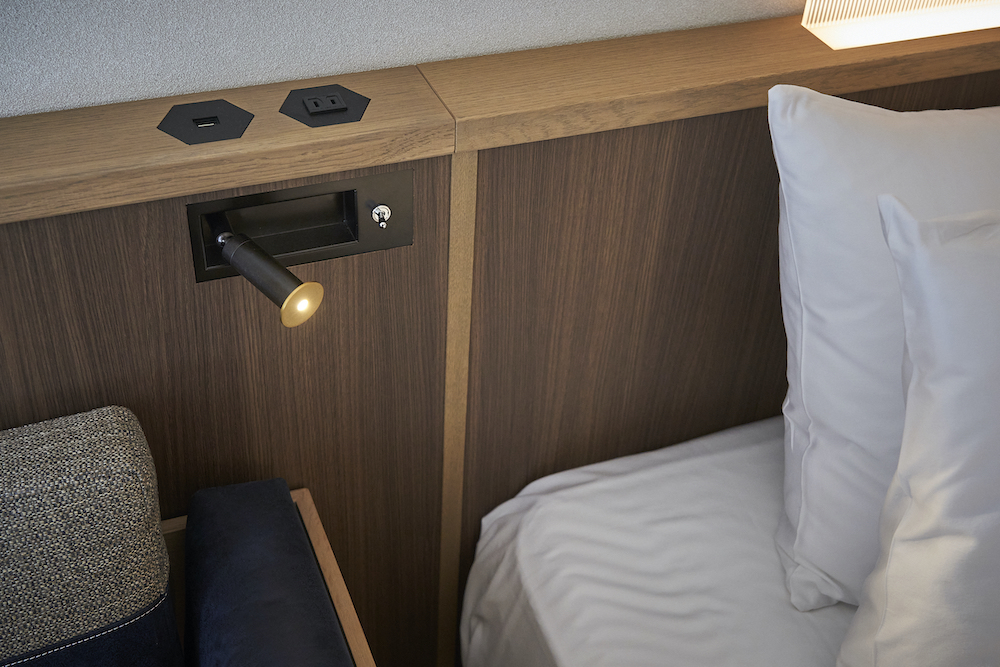 ベッドとソファの間にはコンセント、USBポート、360度好きな方向に動かせる読書灯が。仕事の合間や就寝前の読書タイムに、ソファとベッドどちらにいても使えますね。