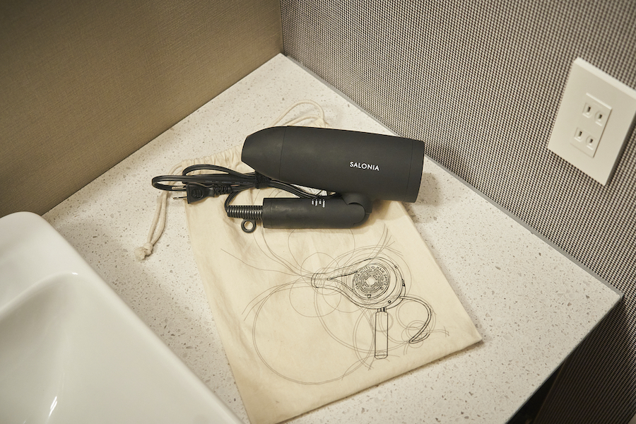 「SALONIA」のドライヤーが入ったバッグは、上野に拠点を置く、家紋工房「京源」によるもの。“デザインとしての家紋”をコンセプトに、伝統技法とデジタル技術を合わせた家紋アート作品やオリジナルの家紋を手がけています。家紋は円と直線のみで構成されていることから、同様のデザインを施しているそう。
