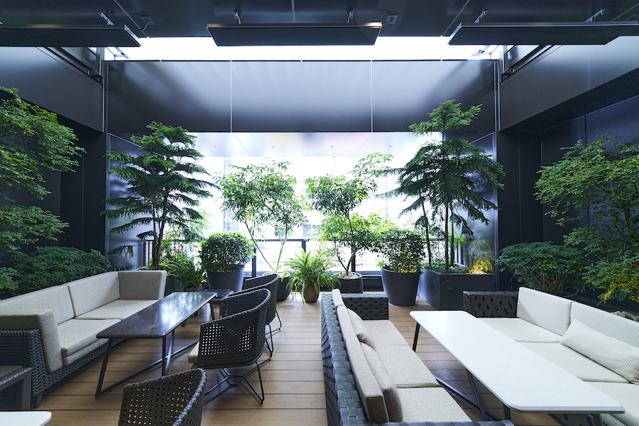 気分を変えて仕事をしたいなら2階のラウンジへ行ってみましょう。室内もいいけど、観葉植物を配したテラスは開放的でおすすめ。館内各所には高音質のスピーカーを設置していて、ホテルのために選曲した、時間帯などによって変化するオリジナルのBGMが流れています。心地いい音楽は仕事の効率もアップしそう。