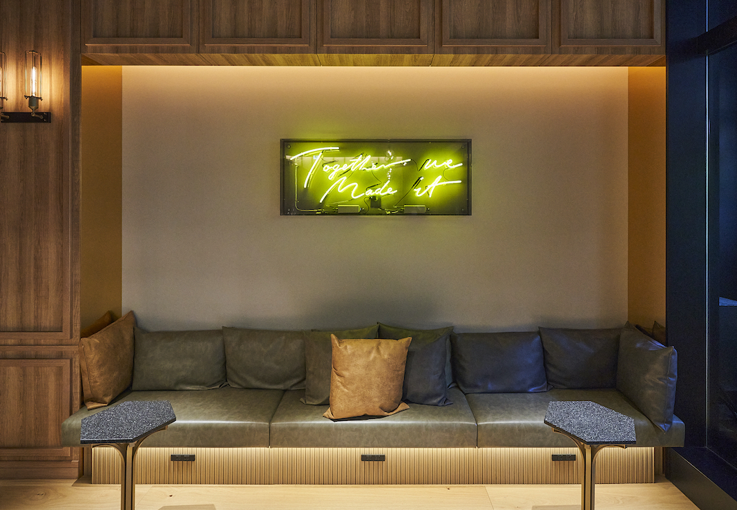 こちらは、オーストラリア人アーティスト、ジェシー・ホーガン氏のネオンメッセージアート「Together We Made It」。スタイリッシュなインテリアとネオンのデジタル感がフォトジェニック!