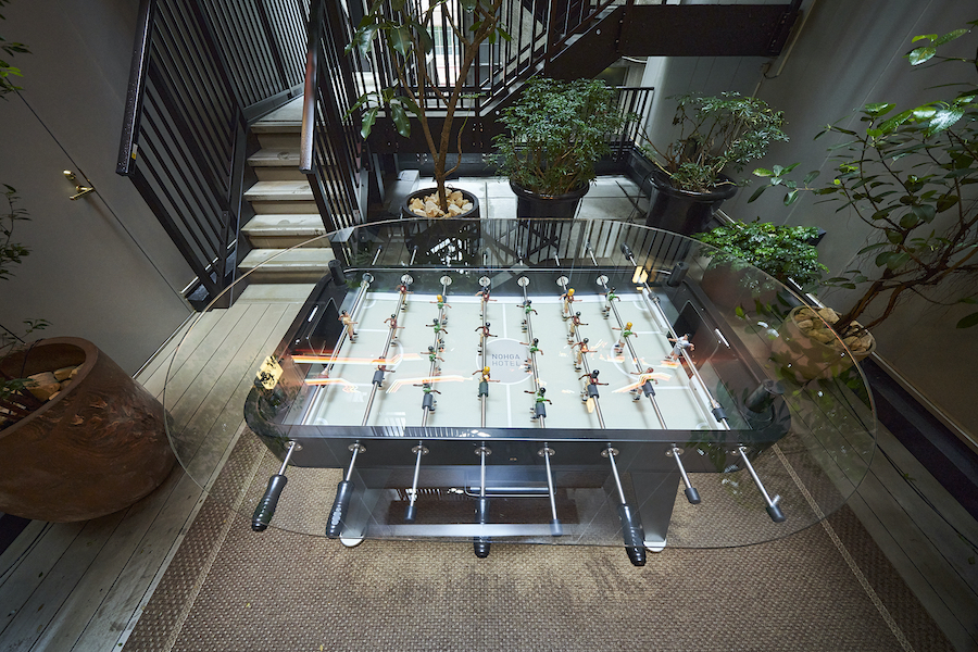 WAKU氏のネオンアートの下にあるのは、バルセロナのデザイナー/アート・ディレクター、ラファエル・ロドリゲス氏がデザインした、ホテルオリジナルのフットボールテーブル。お酒を飲みながら遊べるように、ガラスのテーブルを置いているのだとか。