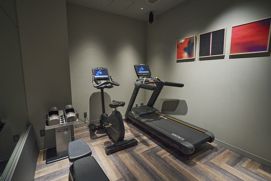 身体を動かしてリフレッシュできるフィットネスルームも完備。フィットネスバイクとランニングマシンは、世界各地の美しい景色がディスプレイに映し出され、バーチャル走行を楽しめます。こちらに展示するのは、グラフィックデザイナー/イラストレーターの大西真平氏によるインクジェットプリント作品。さらに、劇場やライブハウスのスピーカーを設計・製造する「タグチクラフテック」のカスタマイズスピーカーも設置。運動とアート、音楽を一度に体験できちゃいます。