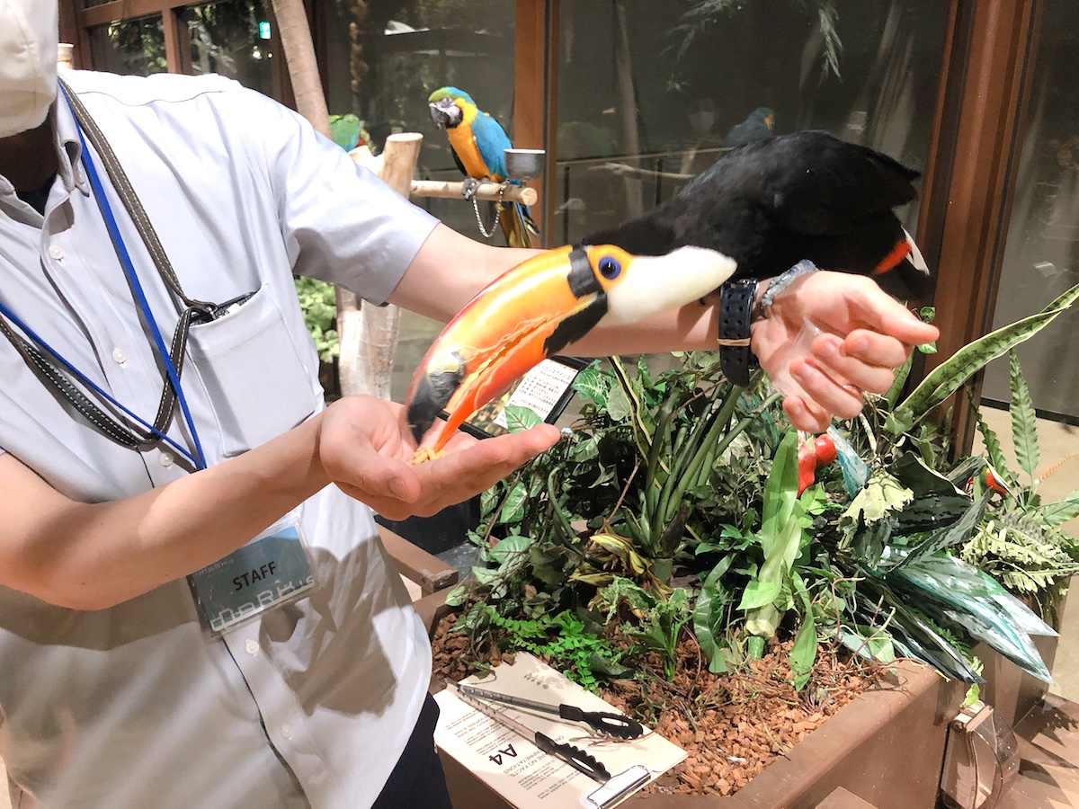 ジャングルのような雰囲気の室内で、早速オニオオハシにおやつをあげてみました!くちばしを器用に使っておいしそうに食べる様子がかわいい!おやつをあげるのが不安なときは、近くのスタッフに声をかけていただくとサポートしてくれますよ。