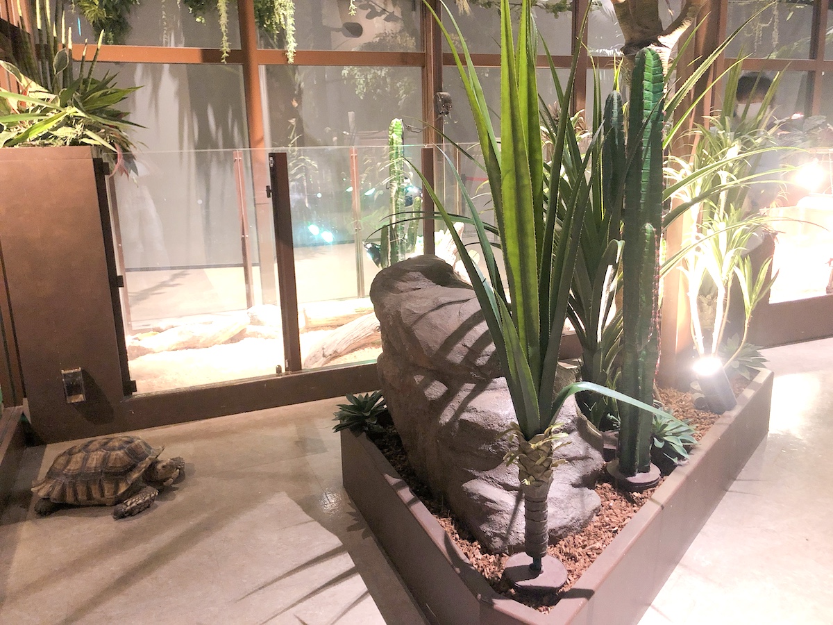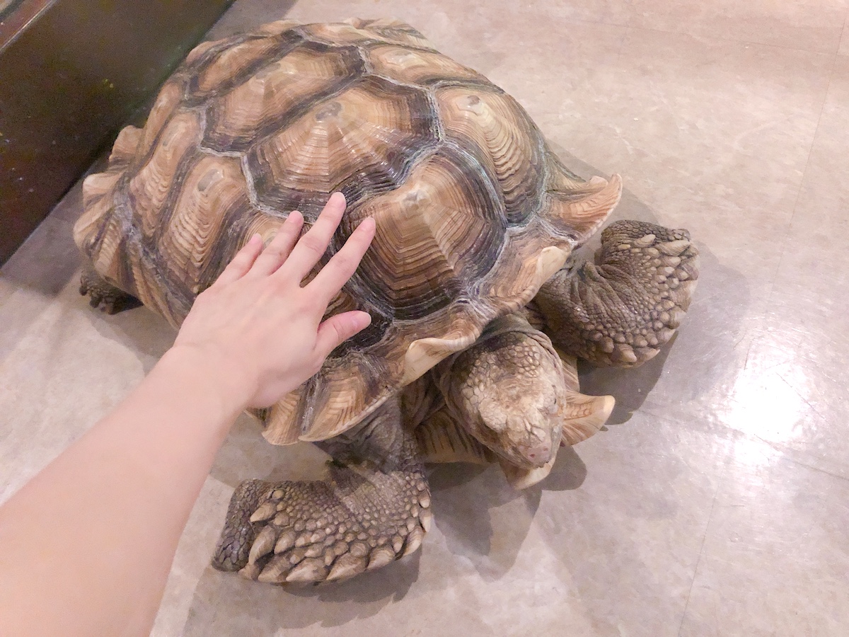 「Moff animal world」の中はエリアごとにひとつの部屋になっており、二重扉にするなどそれぞれしっかりと施錠ができています。そのため、エリア内の動物は自由に中を動くことができるのです。こんな風に近くを歩いていた亀も触ることができました。
