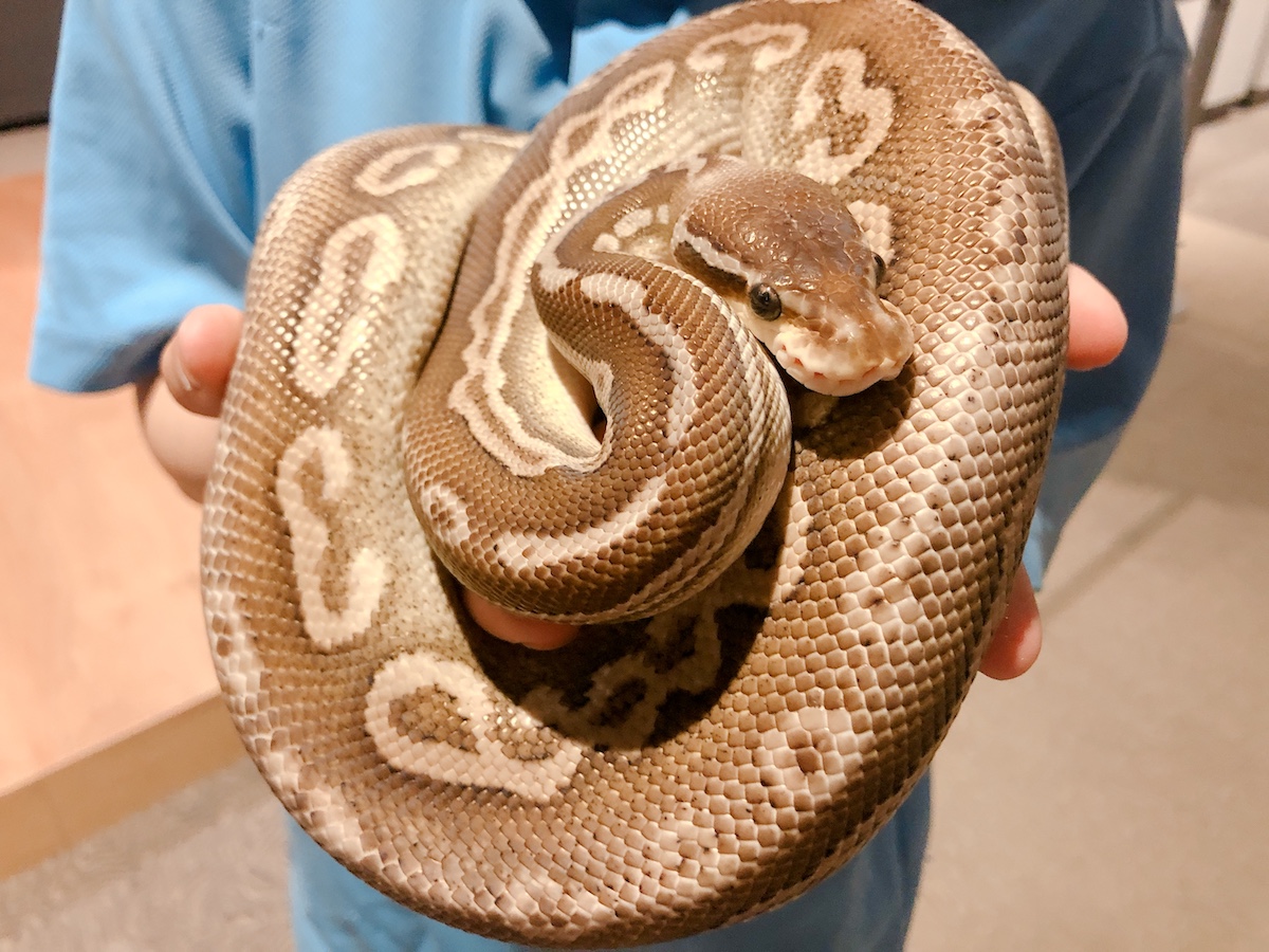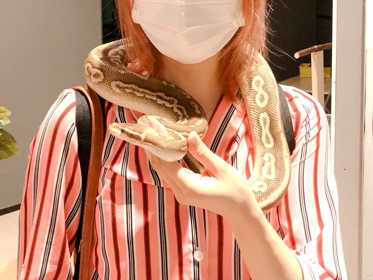 実はヘビの多くの種類はおとなしいものが多いとのことで、噛み付いたり巻きついたりすることなく触れ合うことができるんです。最初はちょっと怖いけど、おとなしく巻きついてくれました。今までにない経験に興奮すること間違いなし!
