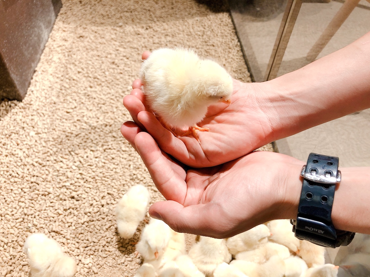 「Interactive animal」の前にあるのが、うさぎとひよこと触れ合うことができる「ピヨパーク」。外に出すことはできませんが、抱っこしたり、てのひらに乗せたり、ぬくもりを感じることができますよ。