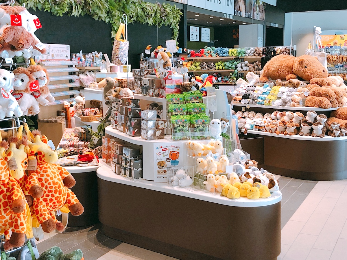 出入口の隣にはお土産コーナーも。その日見た動物たちがぬいぐるみになって勢ぞろいしているので記念に購入してはいかが?