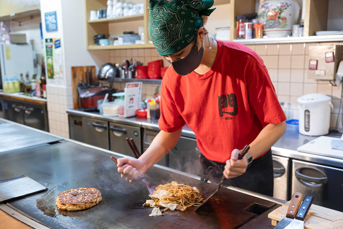 ランチは大阪グルメの定番、お好み焼きでパワーチャージ! よしもと漫才劇場や道頓堀からもほど近い、「お好み焼き 門」を訪れました。
