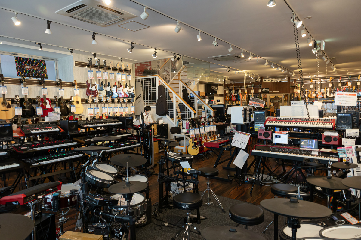 1階にさまざまなギターやベースがずらりと並ぶ同店。最大級のデジタル&ドラムフロアも備え、開放感のある店内でじっくり眺めながら選べるのも楽しいです。もちろん、ギターやベースなどはアンプを繋いでの試奏OK!