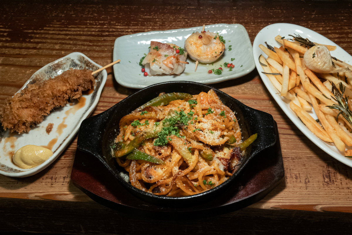 今回オーダーしたのは、手前から時計回りに「あじと名物 鉄板deナポリタン」(580円)、「WAGYUソース串カツ」(290円)、「エビのもち豚巻き」(380円)、「名物 フライdeポテト」(380円)。
