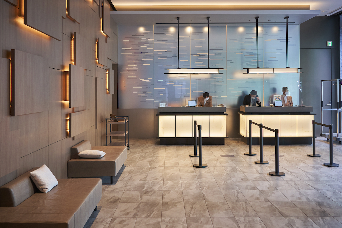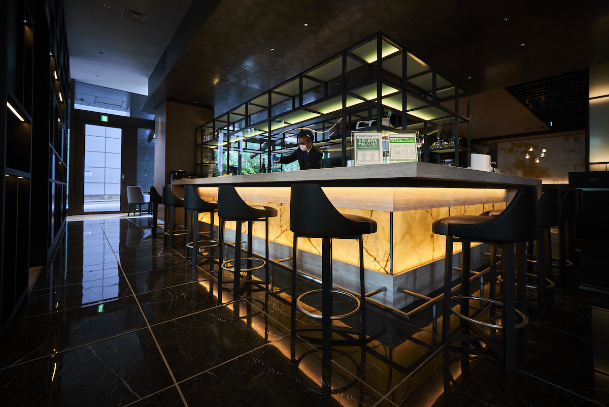 「ACホテル・バイ・マリオット東京銀座」へは、地下鉄東銀座駅から徒歩3分で到着。銀座の街をイメージしたシックな華やぎがあるエントランスにテンションが上がりますね。銀座ワーカーになったつもりでチェックイン! フロントの空間がモダンで、スタッフもフレンドリー。ワーケーションが楽しみです。