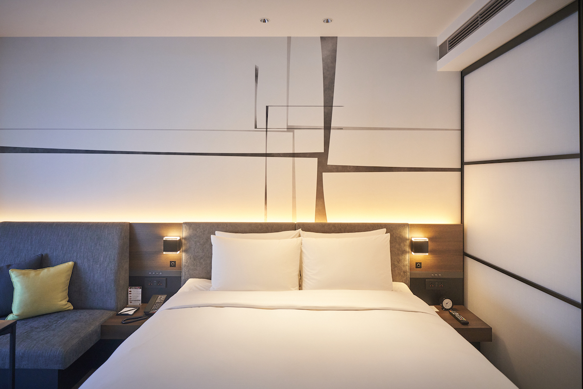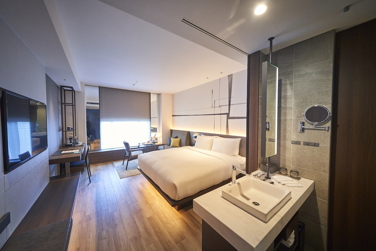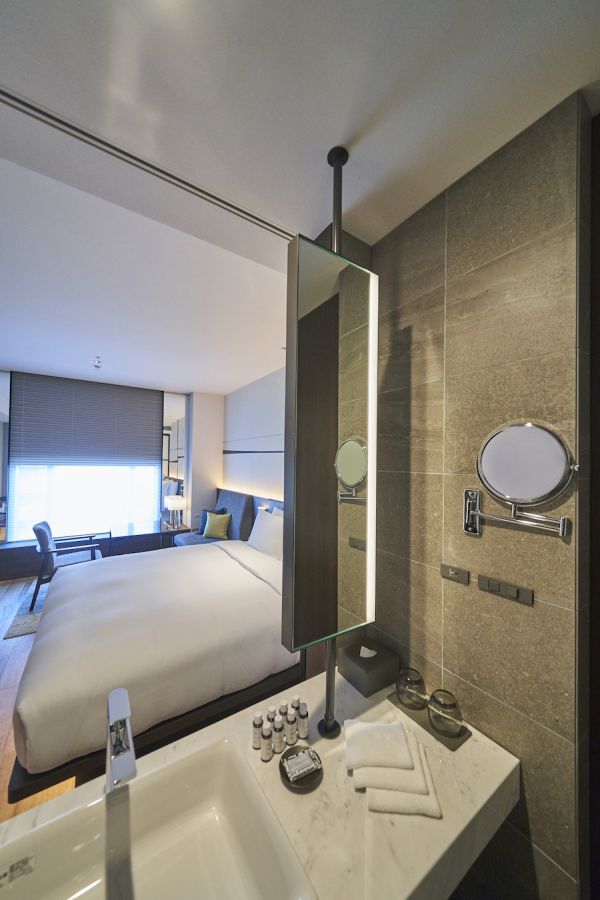 おひとりさまワーケーションにおすすめなのが、30㎡のスーペリアキングの客室。ベッドや棚が宙に浮いたようなデザインと効果的な照明で、かなり広く感じます。洗面スペースが仕切られていないので、さらに広々。もちろん、スライド式の仕切りもありますよ。