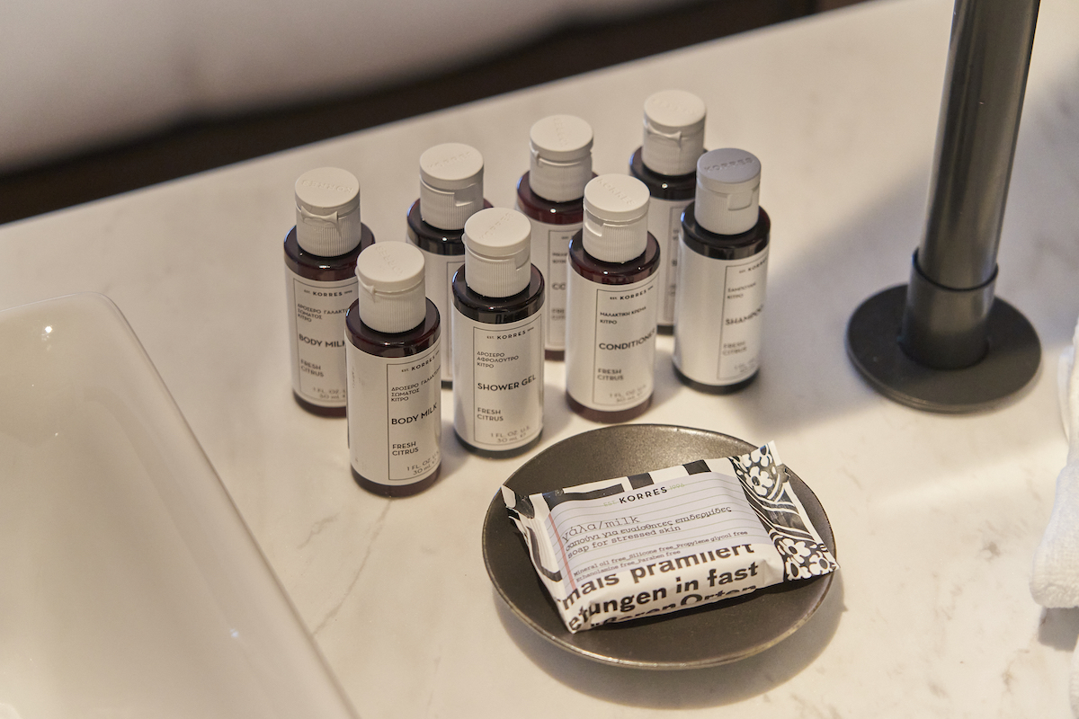 アメニティで注目したいのが、シャンプーやシャワージェルなどのバスアメニティ。ギリシア発祥のブランド「KORRES(コレス)」は、ギリシア最古の薬局に起源をもつブランドで、天然由来成分で作られています。海外のホテルを思わせるすてきな香りなので、仕事に疲れたら、手を洗ったりシャワーを浴びたりしてリフレッシュしてみましょう。