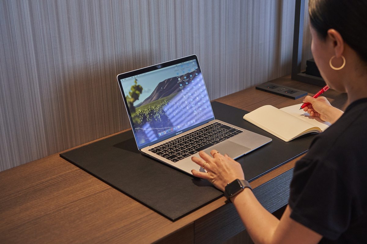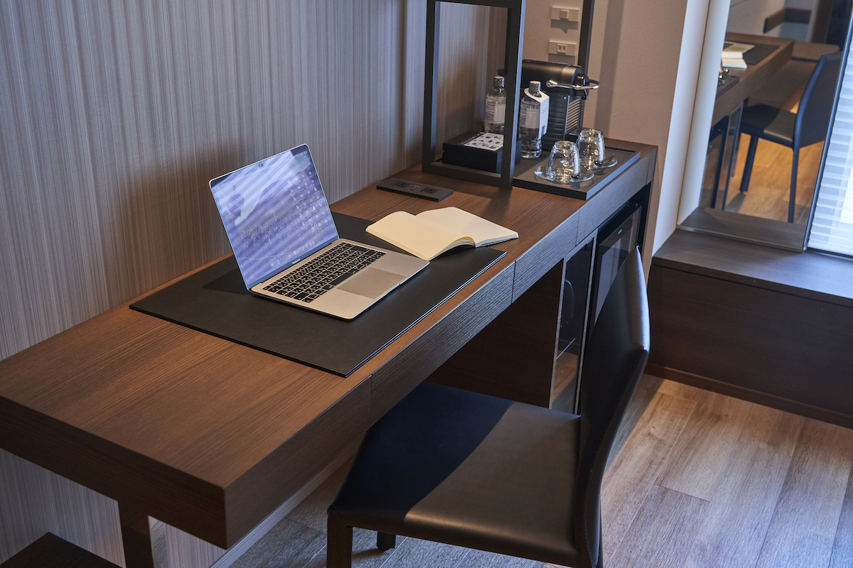 デスクとイスの高さバランスもちょうどよく、デスクマットが敷いてあるので資料に手書きするときも快適! 集中力が必要な仕事をするときは客室のデスクがおすすめです。