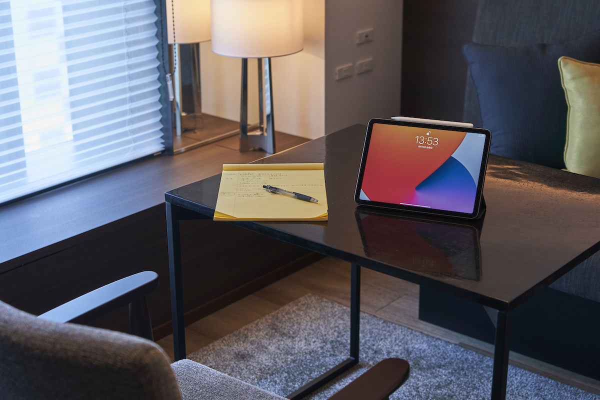 ダイニングテーブルの環境もチェック。こちらはソファなどでリラックスできるコーナーなので、リサーチや資料チェックなどの閲覧作業が向いている気がします。また、デスクで仕事をしたら、こちらのソファに座って息抜きをするなど、客室内のゾーンをうまく活用できそうです。