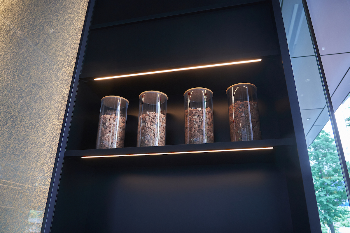 ライブラリーの壁には、“銀座”をイメージしたアートがたくさん飾られています。かつて銀座に多くあったレンガ造りの建物のレンガを砕いたアートや、靴店が多い銀座らしく靴型のアートなど多彩です。壁を眺めているだけで、銀座の情報をインプットできます。