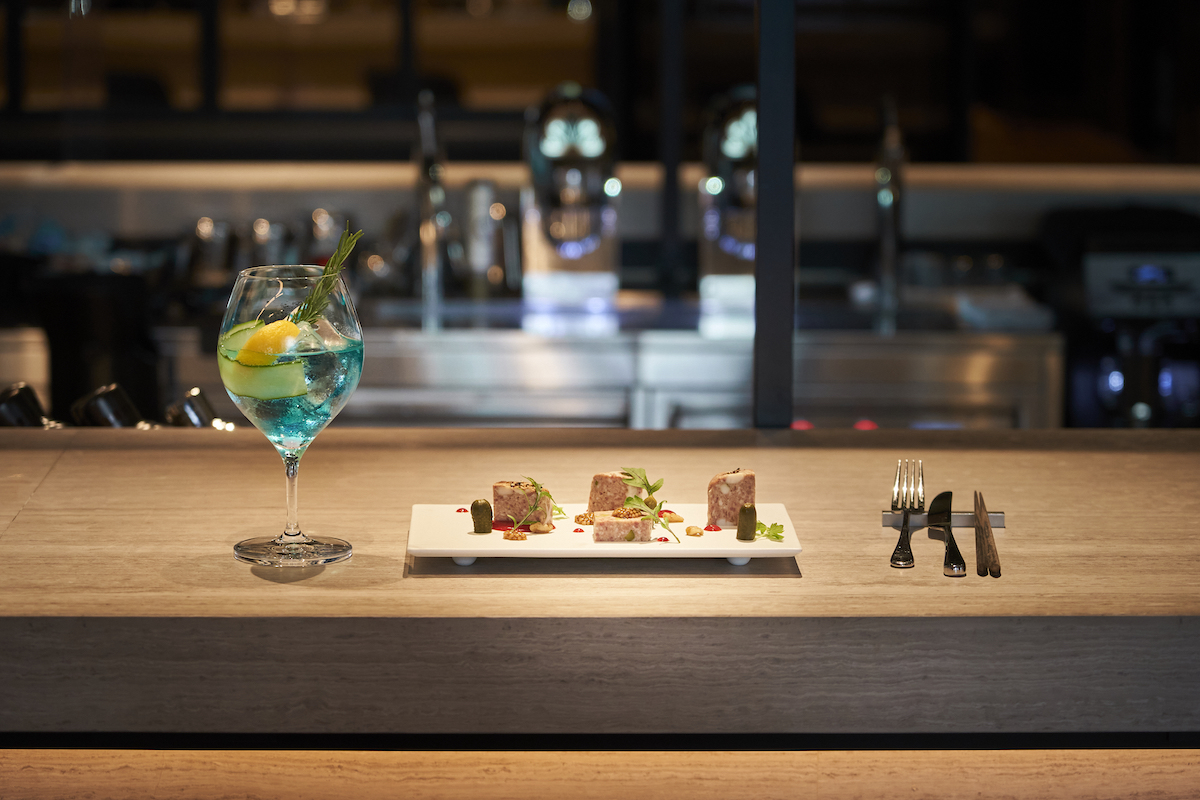 ノンアルコールのACジン・トニックは、ノンアルコールの国産クラフトジンをブルーキュラソーシロップで鮮やかなブルーに色付け。パテ・ド・カンパーニュも、モダンなプレゼンテーションが斬新です。ジン・トニックのブルーとパテ・ド・カンパーニュの赤いビーツソースのコントラストがおしゃれ。おひとりさまワーケーションなので、カウンターでさくっとモクテル(ノンアルコールカクテル)とおつまみで簡単ディナーという選択もありですね。