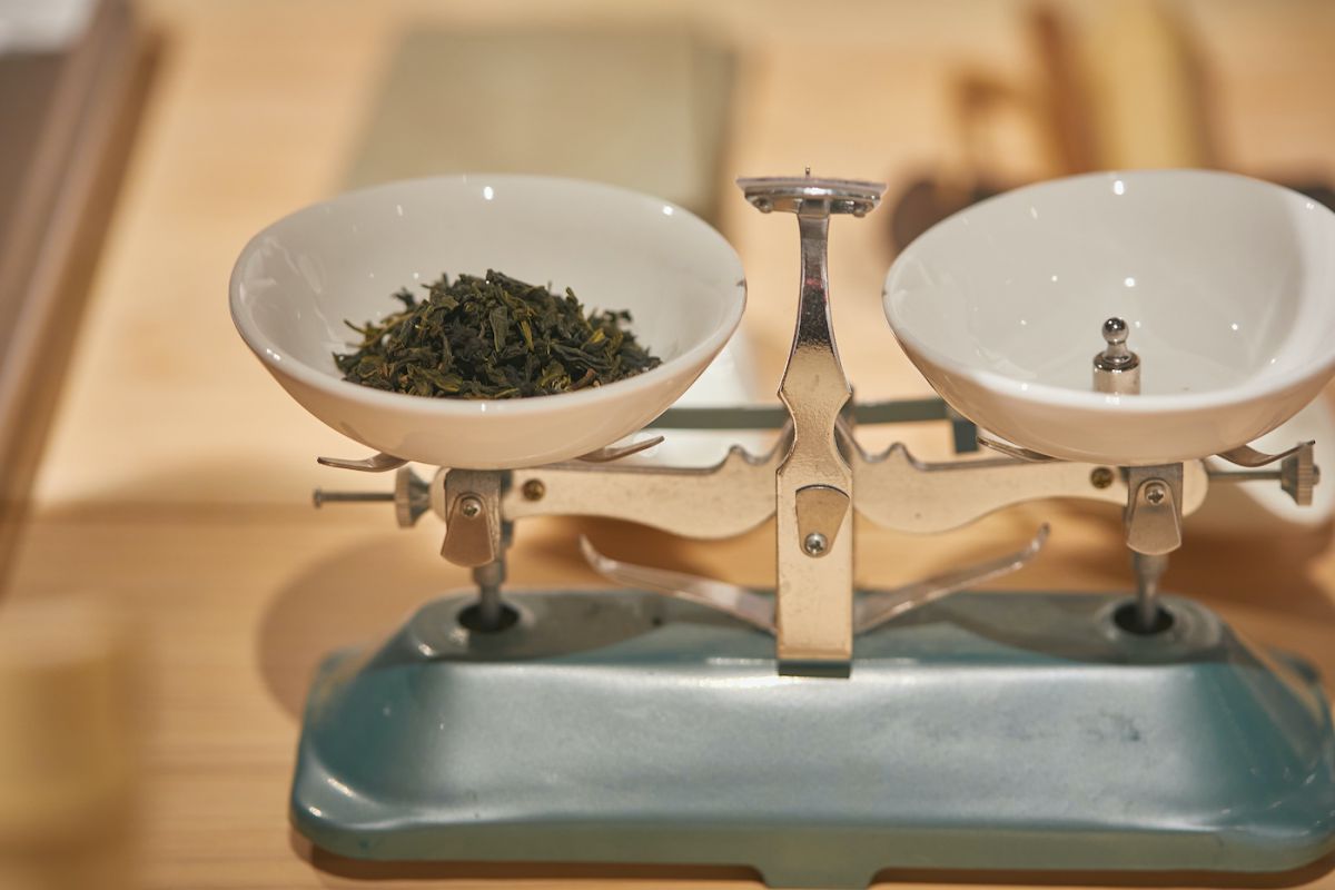 台湾茶を淹れるところを見学。小学校の理科の実験で使って以来目にする分銅(ぶんどう)の秤で、正確にお茶の量を量ります。