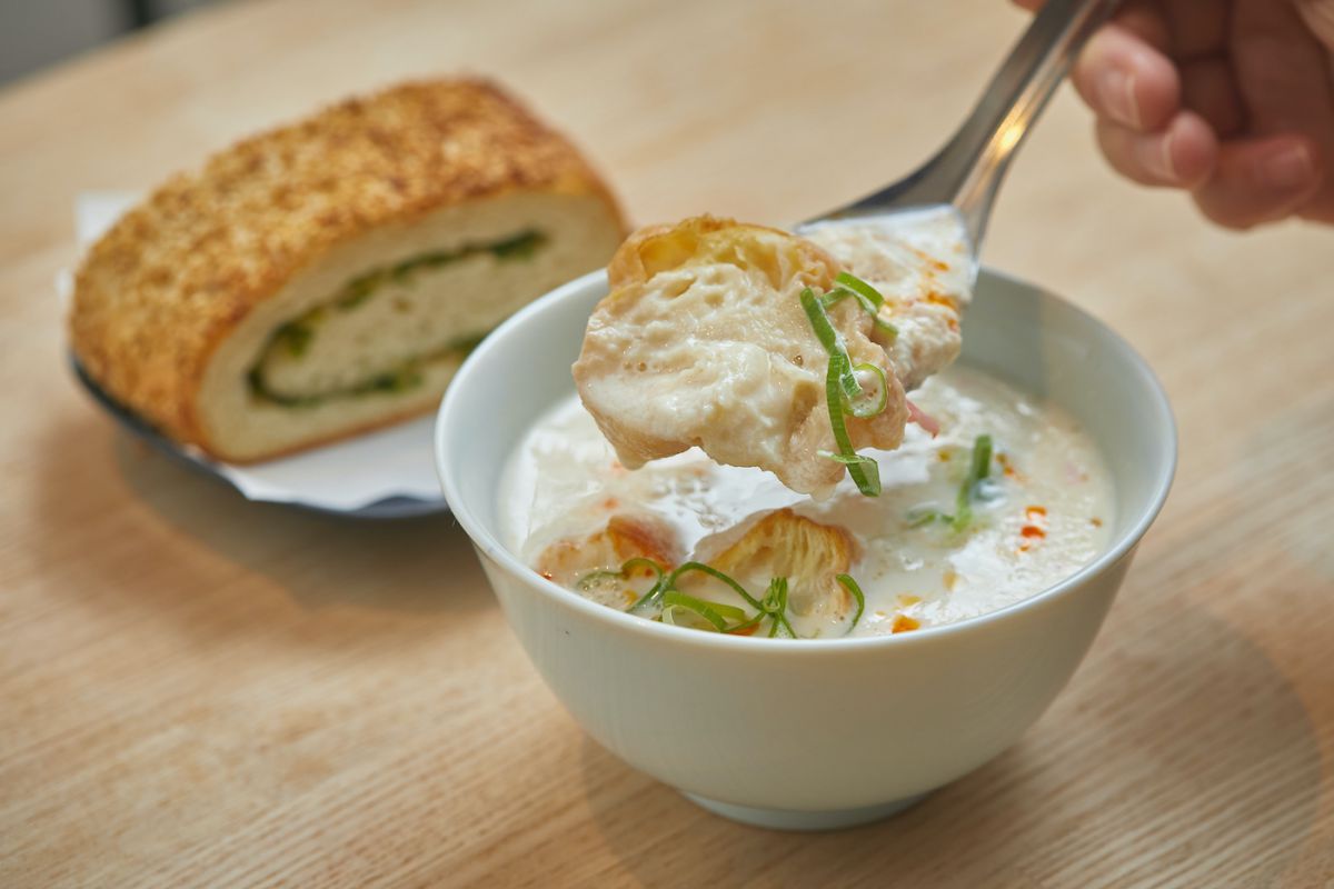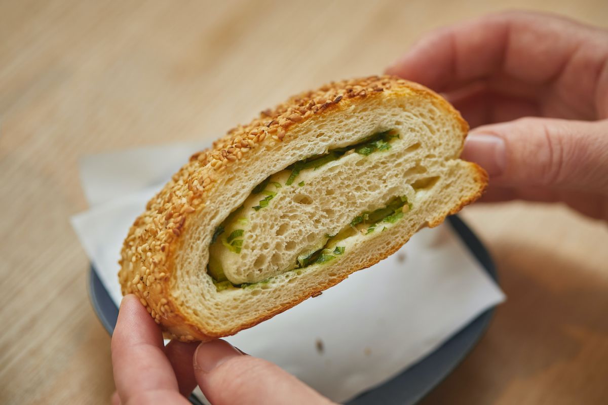 セットの燒餅(シャオビン)は蔥燒餅(ネギパン)か甜燒餅(甘い餡パン)が選べて、こちらはネギパン。ごまと九条ネギの風味が効いています。