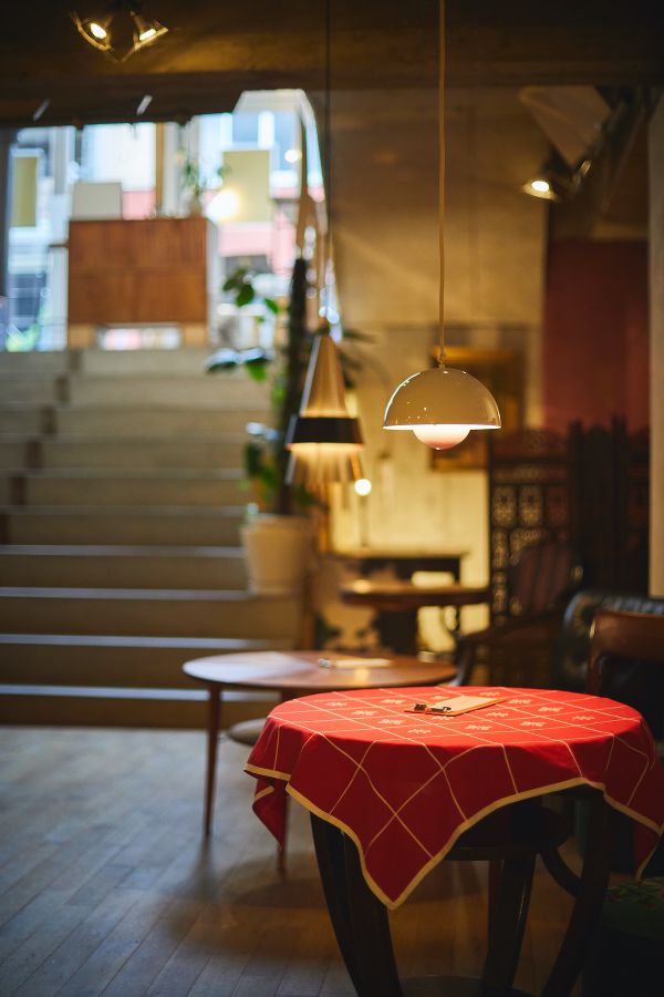 開かれた扉からは、半地下にあるカフェの空間が見られます。静かに階段を降りてカフェ店内へ。