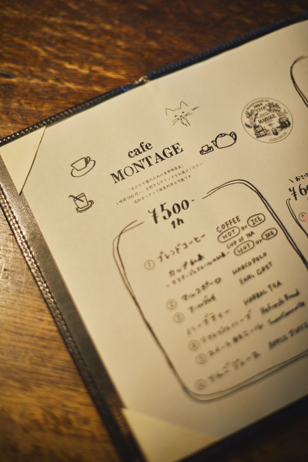 「カフェ・モンタージュ」は、メニューのシステムも独特。1時間の席料が500円~で、そこにドリンクが付いてきます。「500円~」というのは、選ぶドリンクによって少し値段が違うから。1時間居て、居心地がよければもう1杯ドリンクを注文することで、あと1時間居続けることができます。