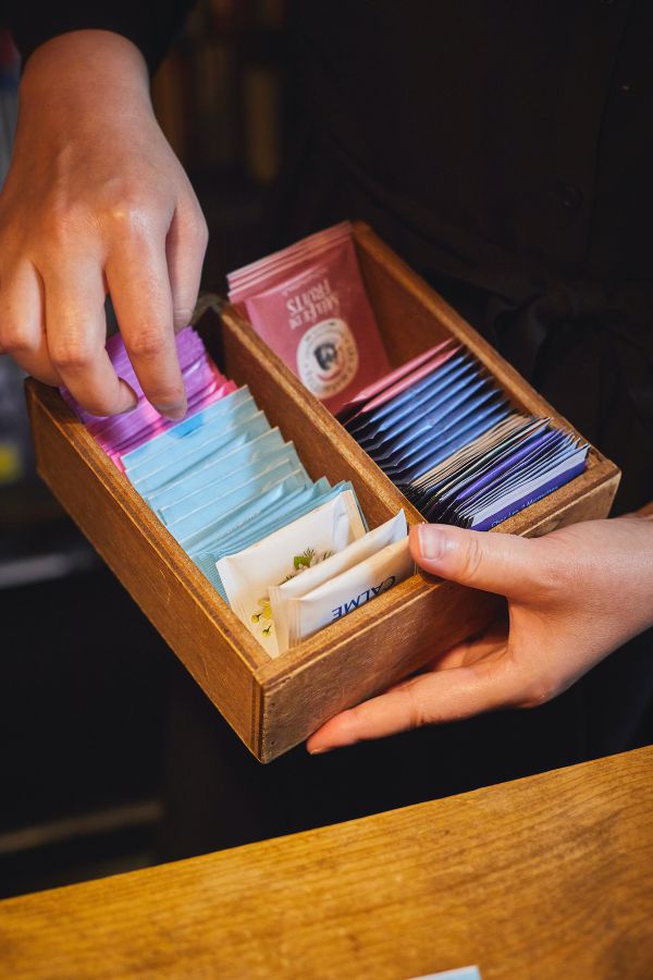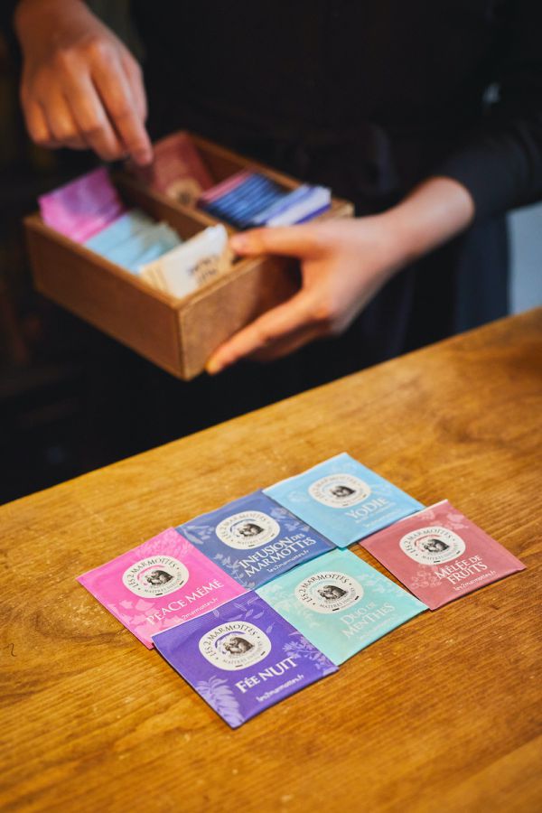 特別に見せていただいたティーバック。アンティークの木の箱に詰め替えられたこれらのお茶はフランス製。夫婦で旅行したフランスで飲んだ味が忘れられなくて、わざわざ現地から取り寄せているそう。