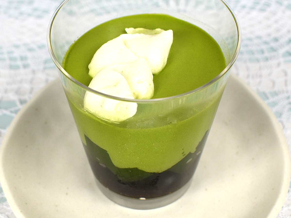 ゼリーを構成しているのは宇治抹茶ムース、宇治抹茶ゼリー、黒糖わらび餅とトッピングのホイップクリーム。透明なカップから見える美しい層に、食べる前からわくわくが止まりません。
