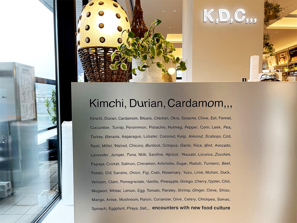 食の未知の可能性を込めてつけられたという施設名称は、本来「Kimchi,Durian,Cardamom,,,(キムチ,ドリアン,カルダモン,,,)」の先に全部でなんと99の食材が並び、最後に「,,,encounters with new food culture」と締めくくられる長い呪文のような言葉!