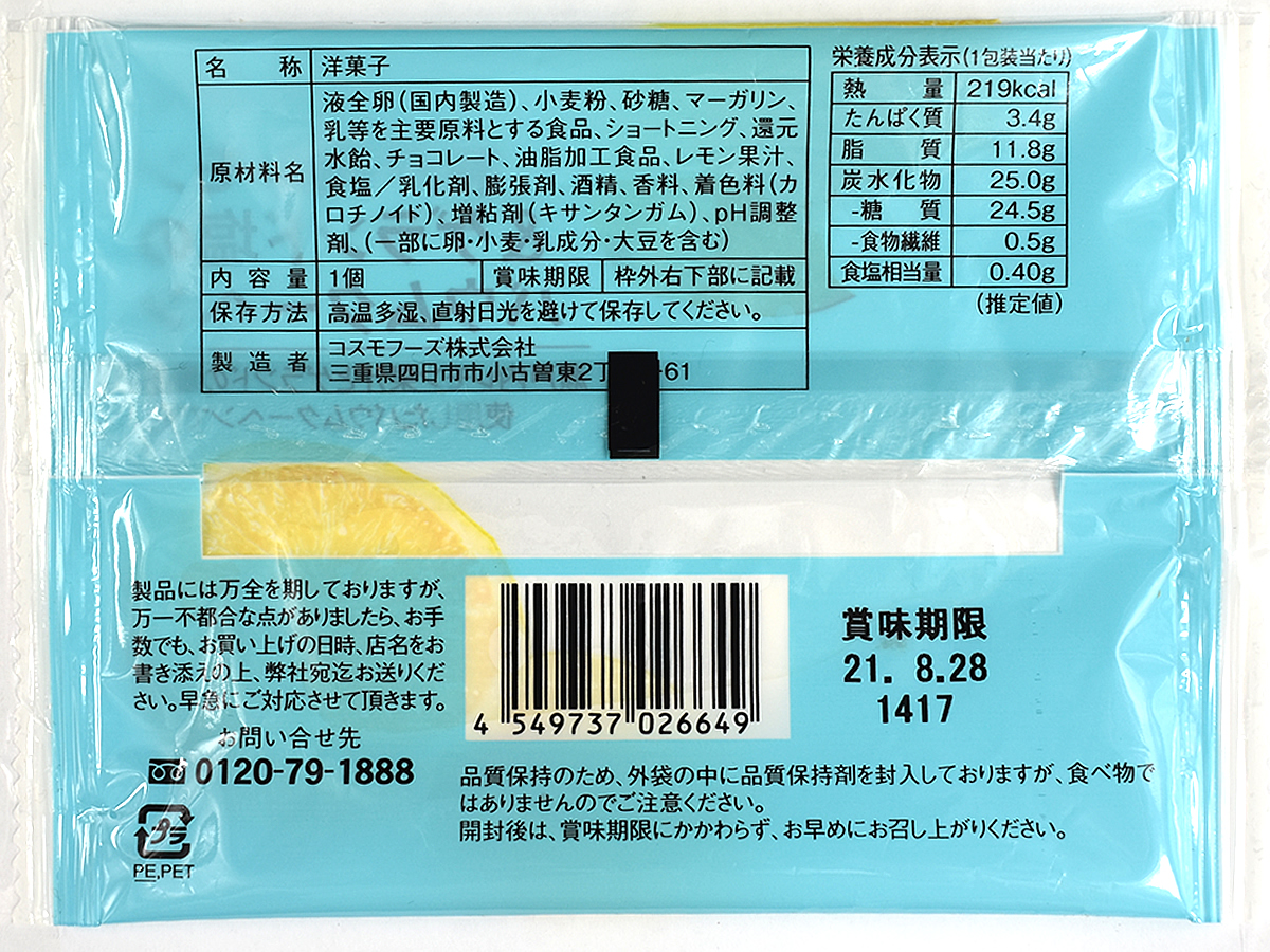 食べてみると、爽快感たっぷりなレモンの香りがふわり。生地はしっとりなめらかで口どけがよく、噛むたびに上品な甘さが広がります。レモンのさっぱりとした風味がとても強く、まるで本物の果実をそのままかじっているかのような気分になります。焼き菓子でここまでジューシーさを再現できるなんて、驚きです!