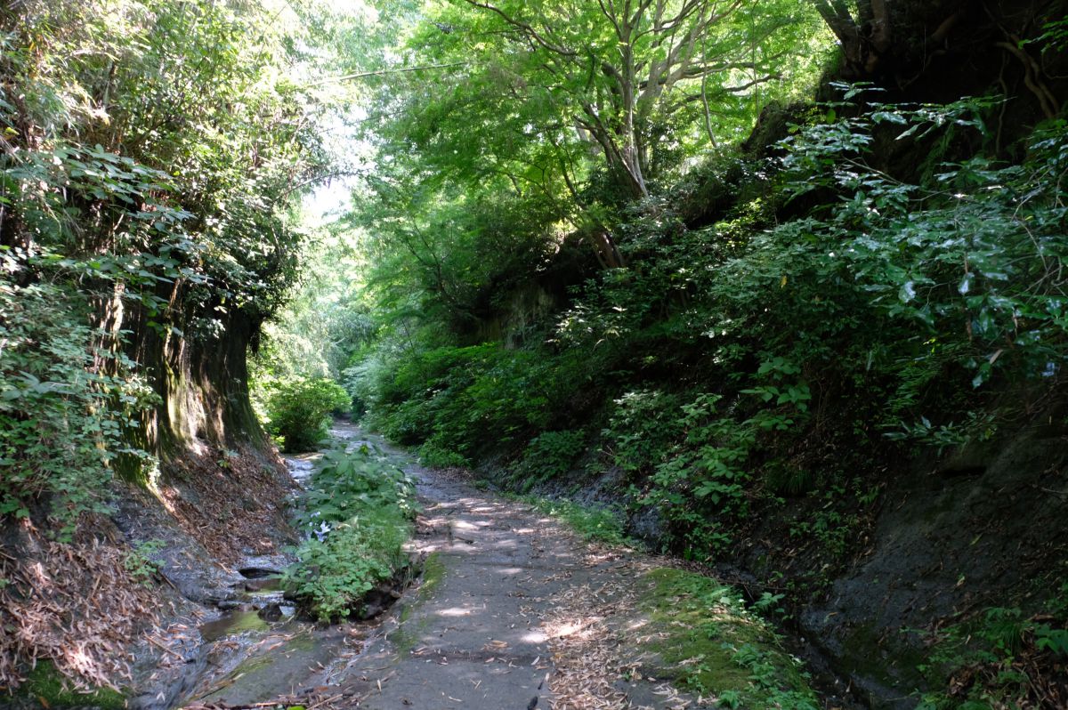 「梶原太刀洗水」の先では、朝夷奈切通の道が続いています。鎌倉七口のひとつで、市内に数ある切通のなかでも、とくに昔の姿をとどめている道です。鎌倉時代の人々になりきって、往時を思いながら歩いてみてはいかがでしょうか。