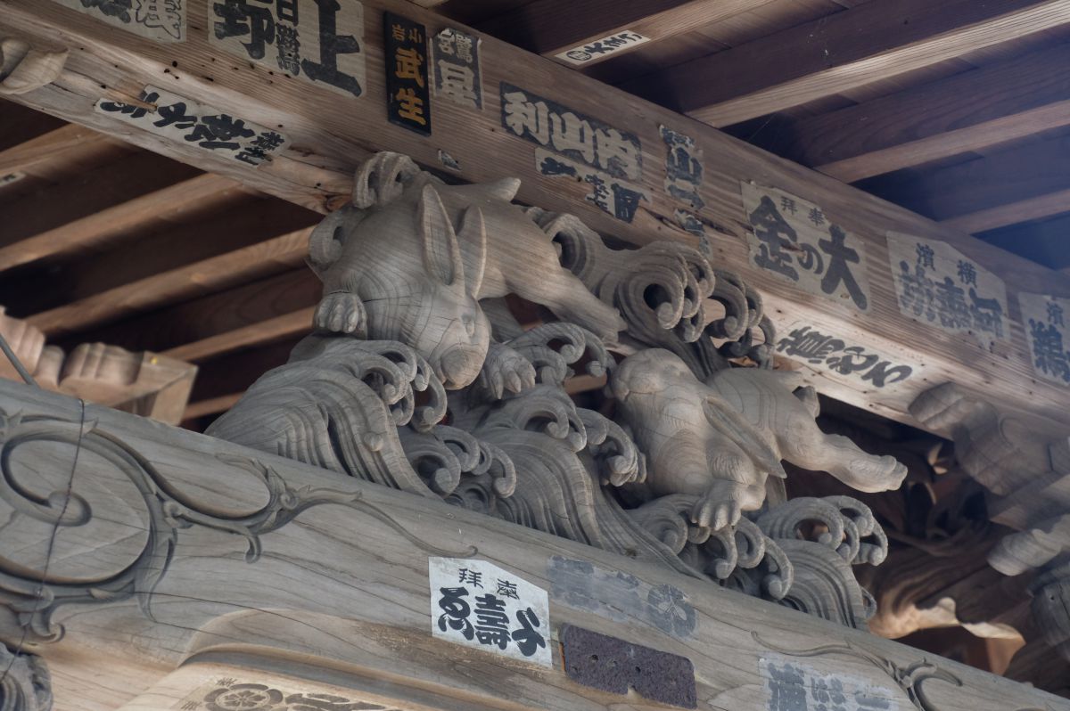 社殿の軒下に目をこらすと、波とたわむれる2羽のウサギが彫られています。月からの使者なのでしょうか。神社建築として珍しいウサギの彫刻も「十二所神社」では見逃せません。