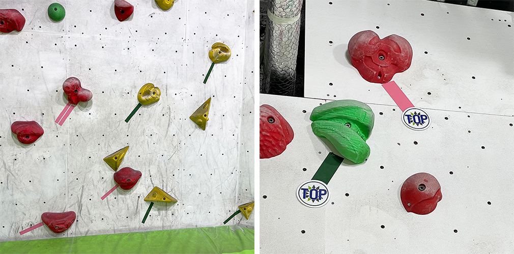 「B-PUMP TOKYO 秋葉原」では、ホールドの色ごとにルートが分かれています。スタートのホールドにはテープが、ゴールにはステッカーがそれぞれ貼られているので、それを目印に登っていきます。