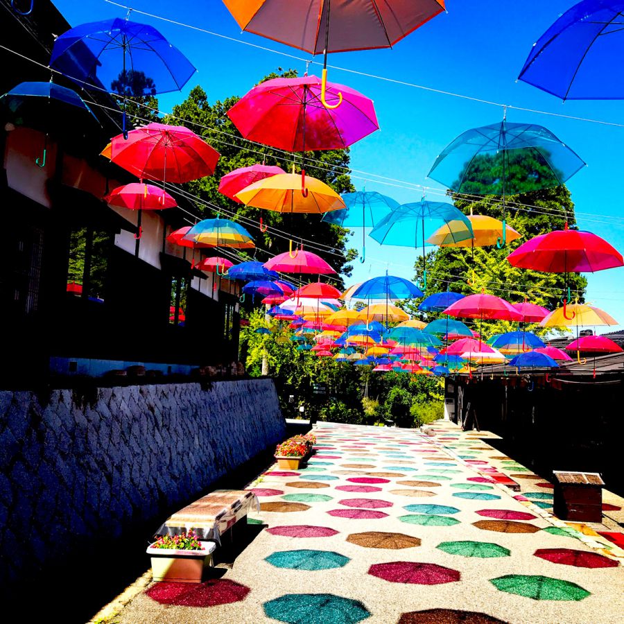 3月上旬〜11月下旬にかけては、アンブレラスカイが出現!趣のある古民家が建ち並ぶ路地は、頭上にカラフルな傘が並ぶ絶好のフォトスポットに。