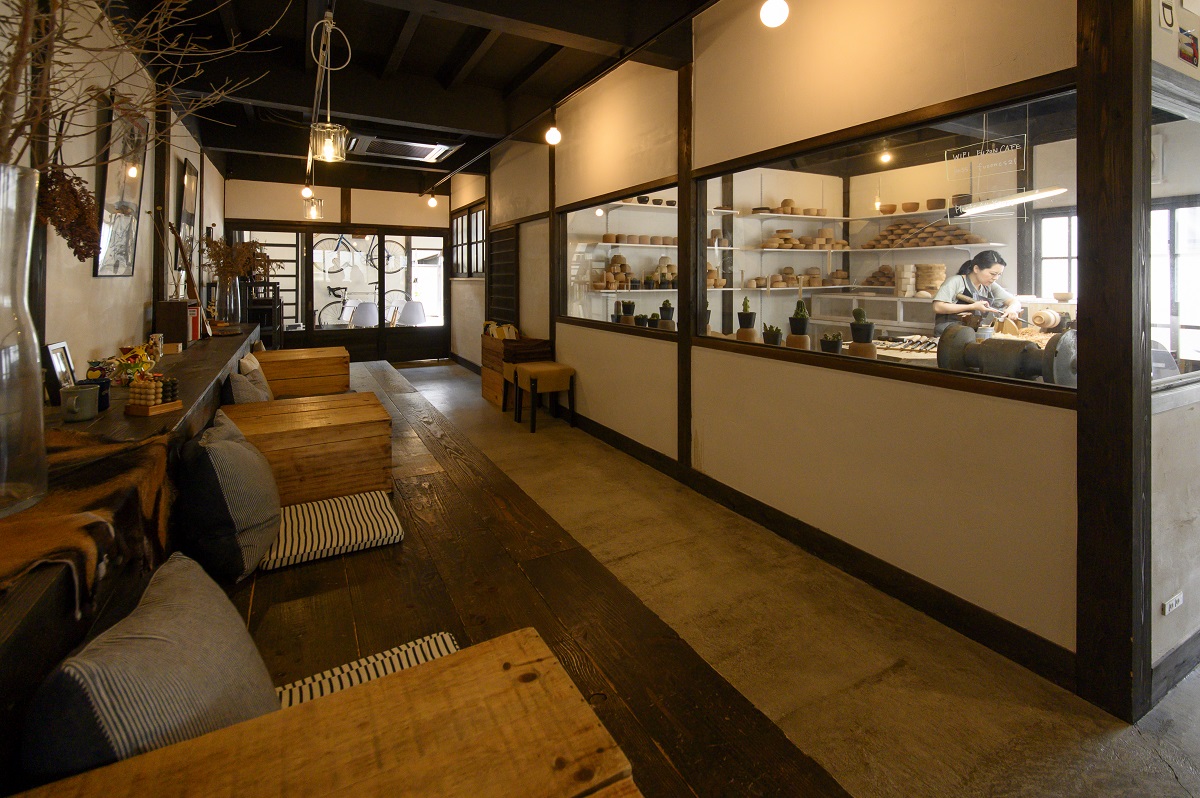 伝統工芸の街・加賀市の中心部、JR大聖寺駅から徒歩10分のところにある築80年の魚市場をリノベーションした町家風カフェ「FUZON 3 KAGA Cafe and Studio(フゾン スリー カガ カフェアンドスタジオ )」。町家ならではの奥まで続く店内には、土間のような小上がりのカフェスペースと工房があります。
