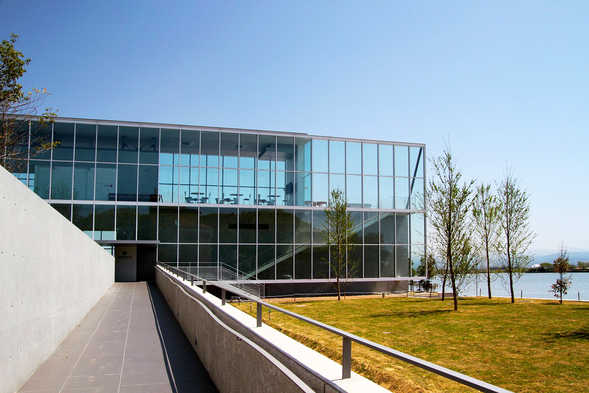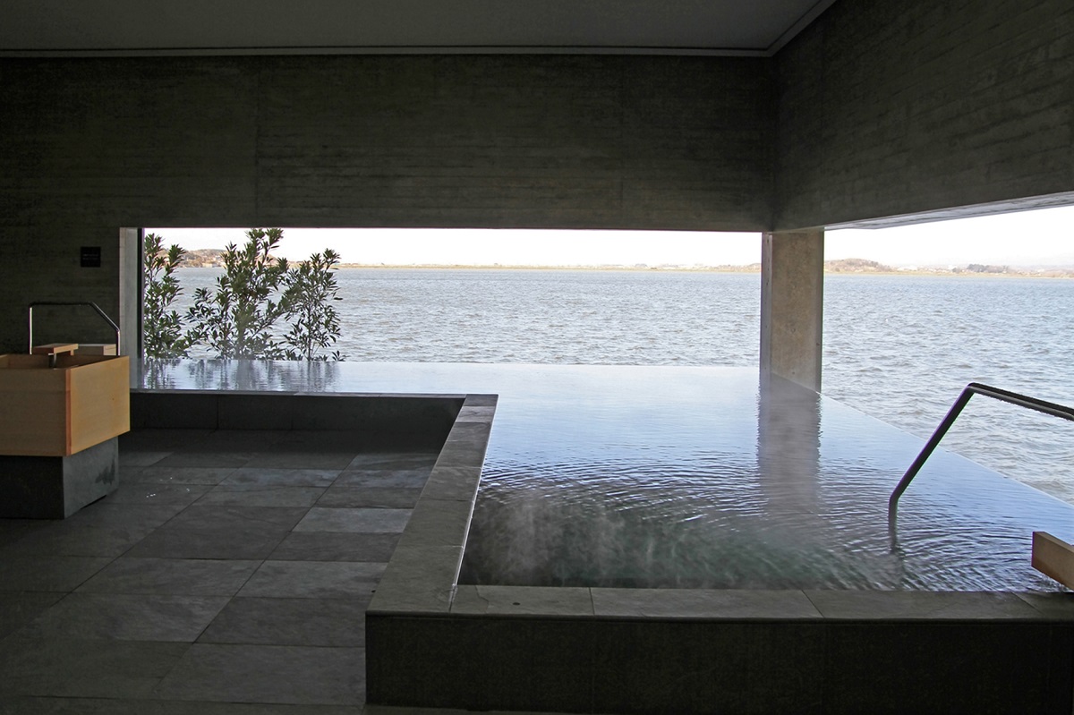 \ 柴山潟の自然に調和するガラス張りの「総湯」 /