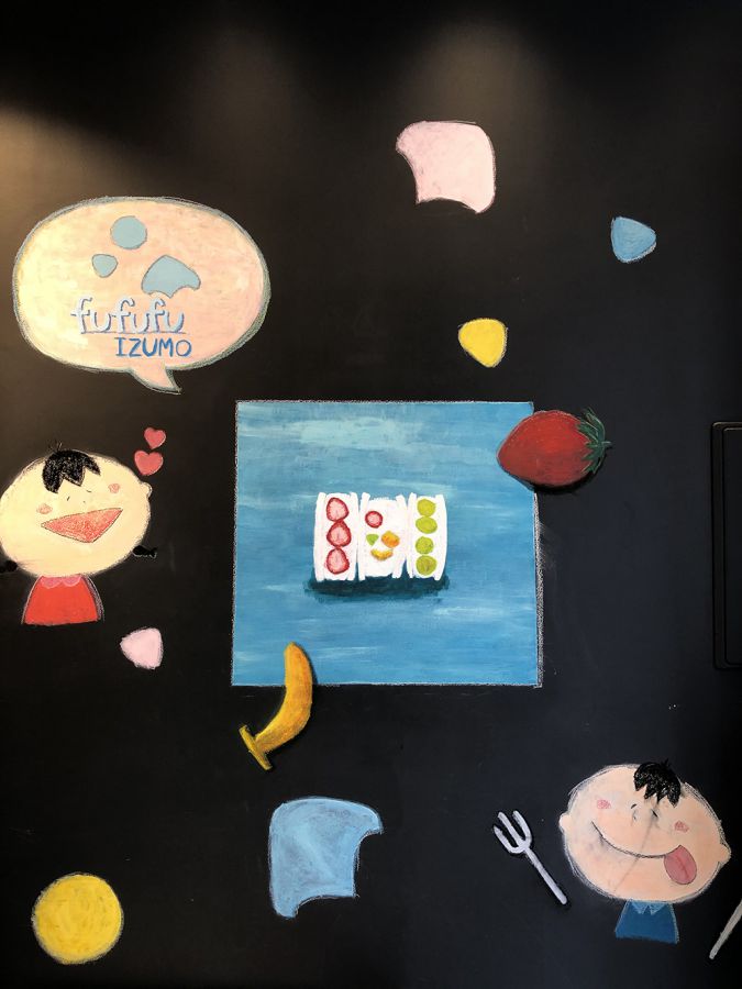 店内の壁にはそのコンセプトを表現しているであろう、フルーツサンドを目の前にして「ふふふ」と笑いあっているような女の子と男の子の絵が一面に描いてあります。こんな贅沢なフルーツサンドを目の前にしたら、だれでもきっとこの絵のように無邪気な笑顔になってしまうこと間違いなしです。