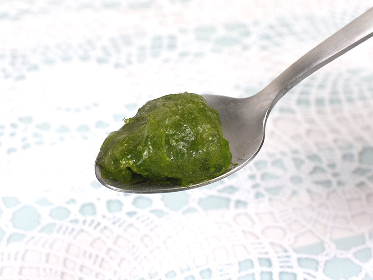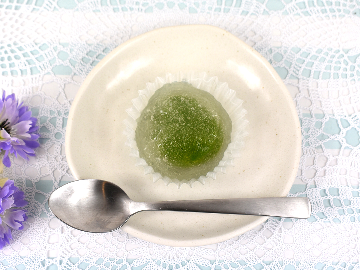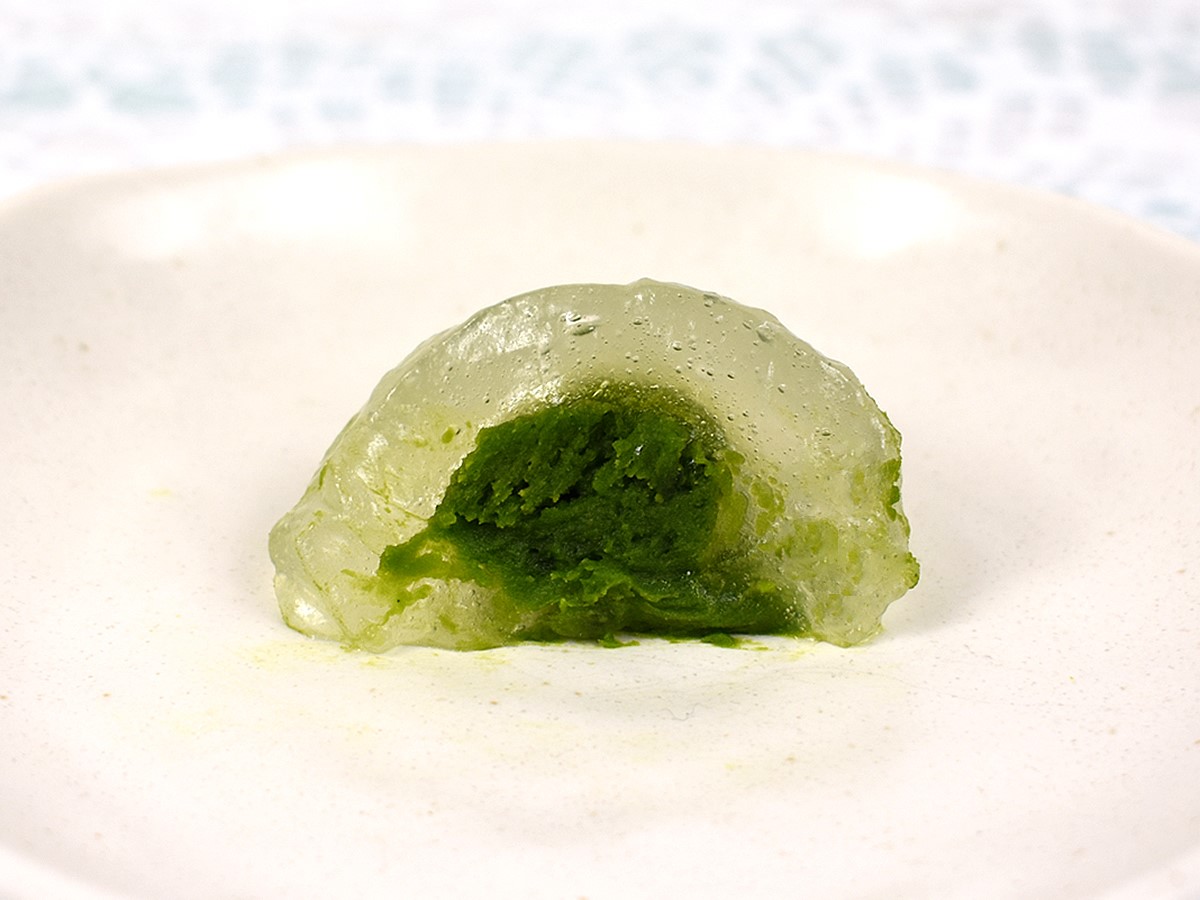 パッケージを開けると、透明の生地が涼しげな「葛まんじゅう」が登場。つやつやぷるぷるの生地の中に緑の餡が透けている、まるで宝石のような見た目にキュンとしてしまいます。頬張った瞬間に葛独特のもちもち食感にびっくり。ねっとりとした弾力と、とろけるような舌触りがたまりません。