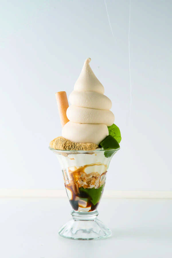 布久パフェ1280円はきなこソフト、わらび餅、抹茶アイスなど多彩な味わいが特徴です。