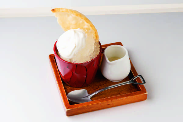 高山の晩冬をモチーフにした、甘酒をかける白いパフェ雪どけ(日本茶付き)700円。