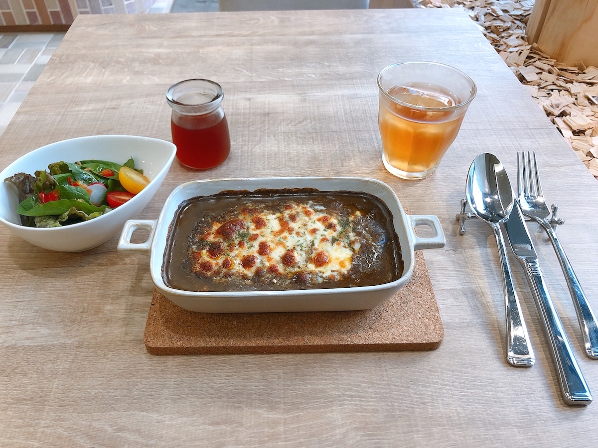 「モッツァレラチーズの焼きカレーセット」は、18種類のスパイスをブレンドしたスパイスカレーにモッツアレラチーズをのせた人気メニュー。サラダ、ミニデザート、アイスティーがセットになっています。