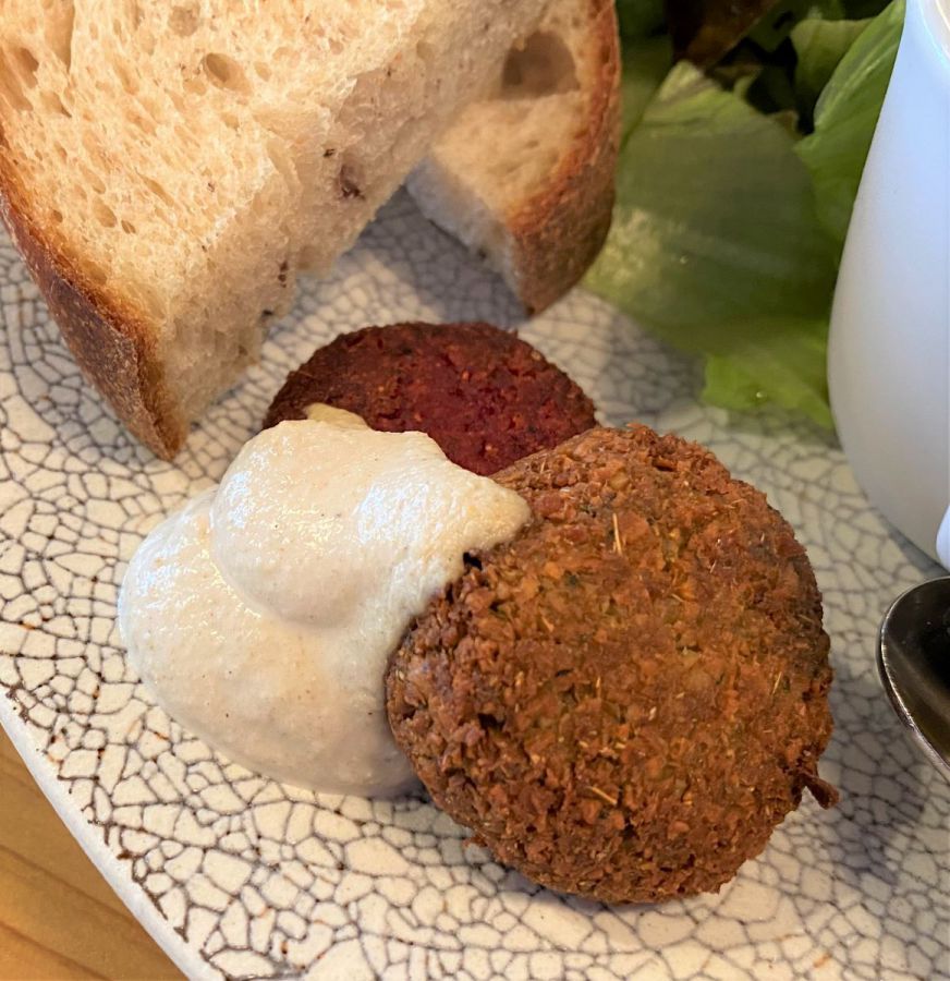 ファラフェルとフムス、どちらもあまり聞きなじみがないかもしれませんが、中東の料理でヴィーガン料理では定番のメニューだそう。ファラフェルとは、ひよこ豆にスパイスをまぜてあげた中東風のコロッケのこと。「Sustainable Kitchen Rosy」では有機大豆を使い、さらに白ごまとカシューナッツのソースをかけるアレンジをしています。口にしてみると、大豆とスパイシーな香ばしさが口のなかに広がります。またソースと一緒に食べれば、なめらかな味に!これはクセになるおいしさ!
