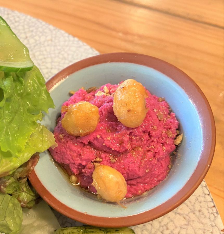 フムスとは茹でたひよこ豆にニンニクやオリーブオイル、ねりごまなどを加えてペースト状にすりつぶした料理です。「Sustainable Kitchen Rosy」では有機大豆を使用し、そこに栄養満点なビーツを加えてアレンジしています。色鮮やかなピンク色が目にもおいしいこちらの料理は、口にしてみるとビーツのほんのりとした甘さとバターのようなコクが感じられました。パンや野菜につけてもGOOD!