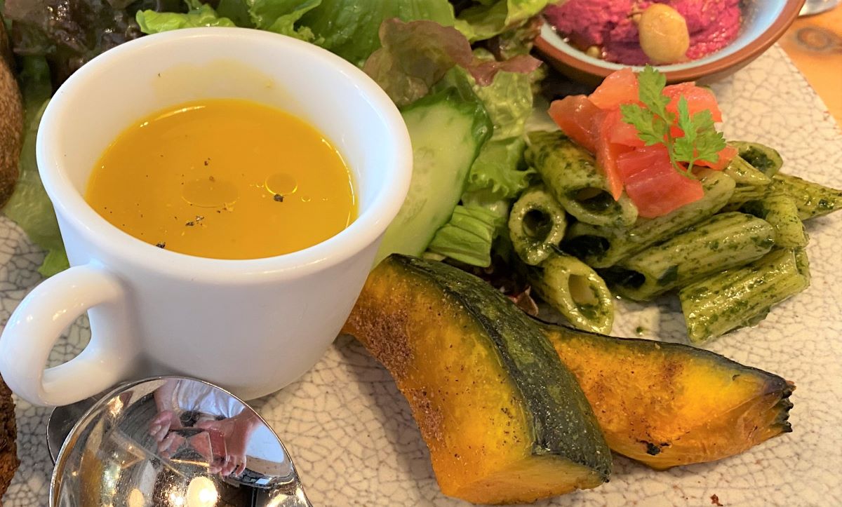 スープはヴィーガン仕様なので、ブイヨンなどは使わずにお野菜のみで仕上げられています。「ロロンかぼちゃ」はマロン、つまり栗のような甘みがあることから名づけられており、「ロロンかぼちゃ」特有の上品な甘みとお野菜のだしがしっかりきいて絶品でした。
