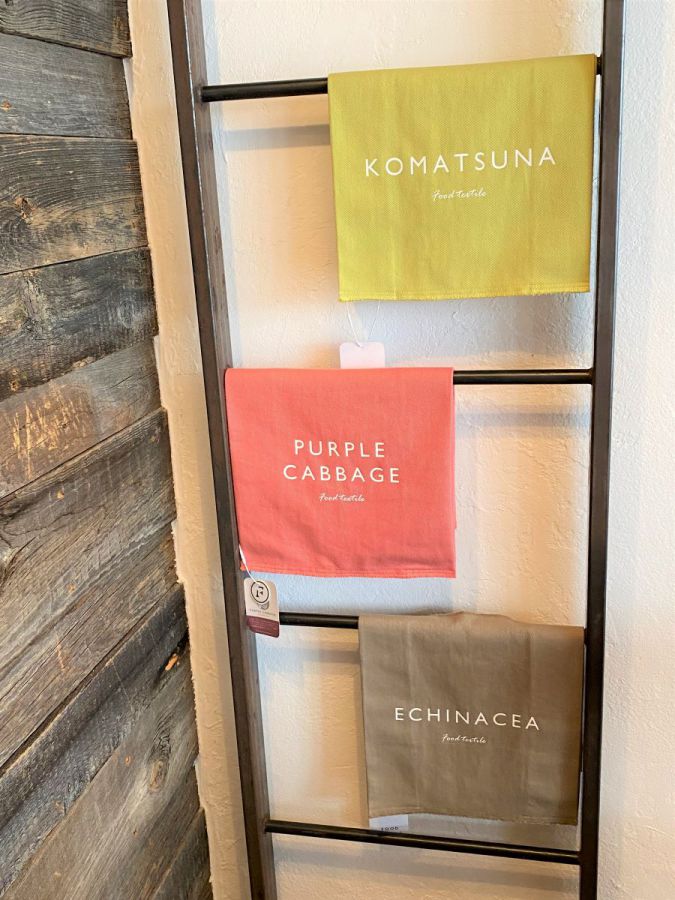 たとえば店内で使用しているリネンやスタッフの方のユニフォームには、オーガニックコットンを使用しています。エプロンは野菜の色素で染めたフードテキスタイルで、お店ではフードテキスタイルを使ったエコバッグも販売中。やさしい色合いがかわいい!
