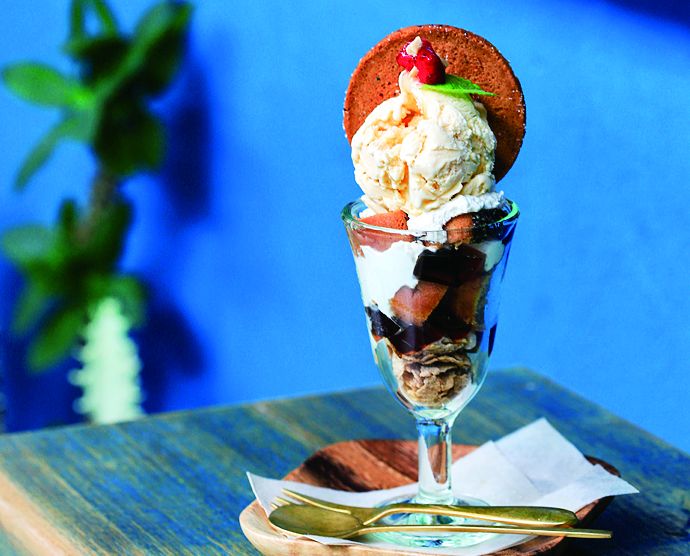 屋我地島(やがじしま)にある、築40年以上の古民家をリノベーションしたカフェ。古民家の風合いを残しつつ、アンティーク調の家具が落ち着いた空間を演出しています。「島やさいたっぷりサンドイッチプレート」1058円など野菜をしっかり味わえるメニューが人気ですが、自家製バニラアイスと小さくカットしたドーナツ、コーヒーゼリーが好相性の「ドーナツパフェ」520円(写真)もおすすめです。