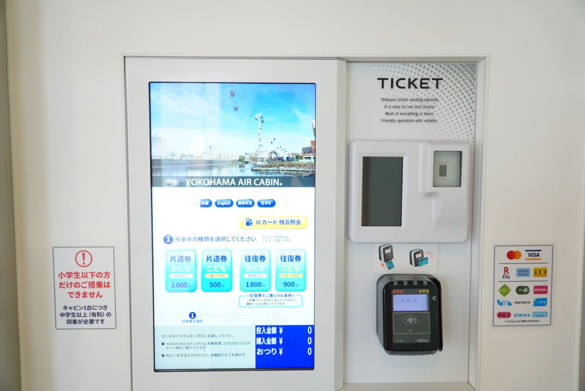 タッチパネルでチケットを購入します。片道大人(中学生以上)1000円、子ども(3才〜小学生)500円、往復は大人1800円、子ども900円。クレジットカードや各種電子マネーも利用できます。