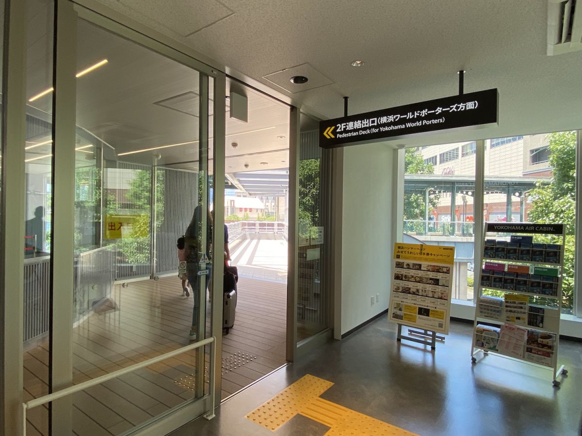 運河パーク駅は2階建てになっていて、キャビンから降りると2階からそのまま「ワールドポーターズ」への連絡通路につながっています。復路のチケットは購入当日の運行時間内であればどのタイミングで利用してもOK。