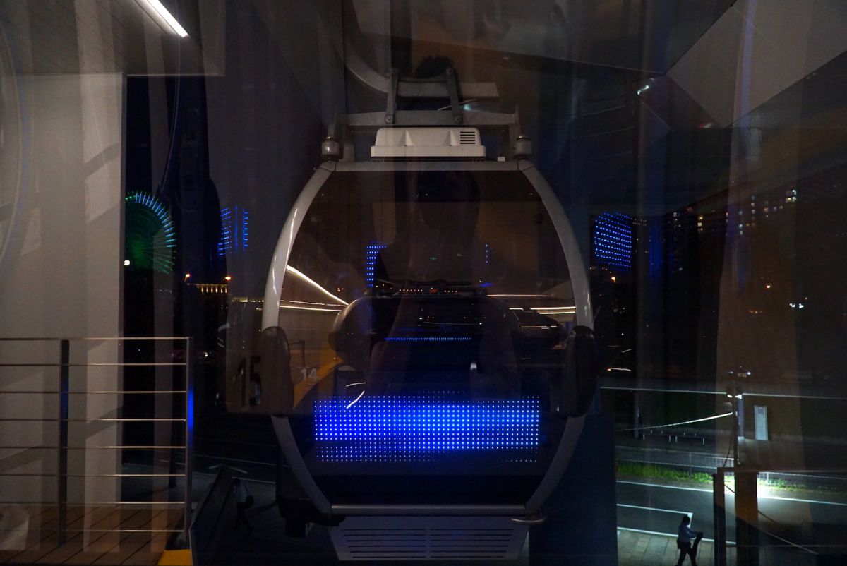 「YOKOHAMA AIR CABIN」は2021年7月現在、20時まで運行中。美しい青空とみなとみらいの絶景に満足していましたが、みなとみらいは夜景の名所であることを思い出し、日が沈んだ19時30分ごろ再訪。照明デザイナー石井幹子さんが手掛けたライティングに彩られたキャビンがすでにおしゃれ!