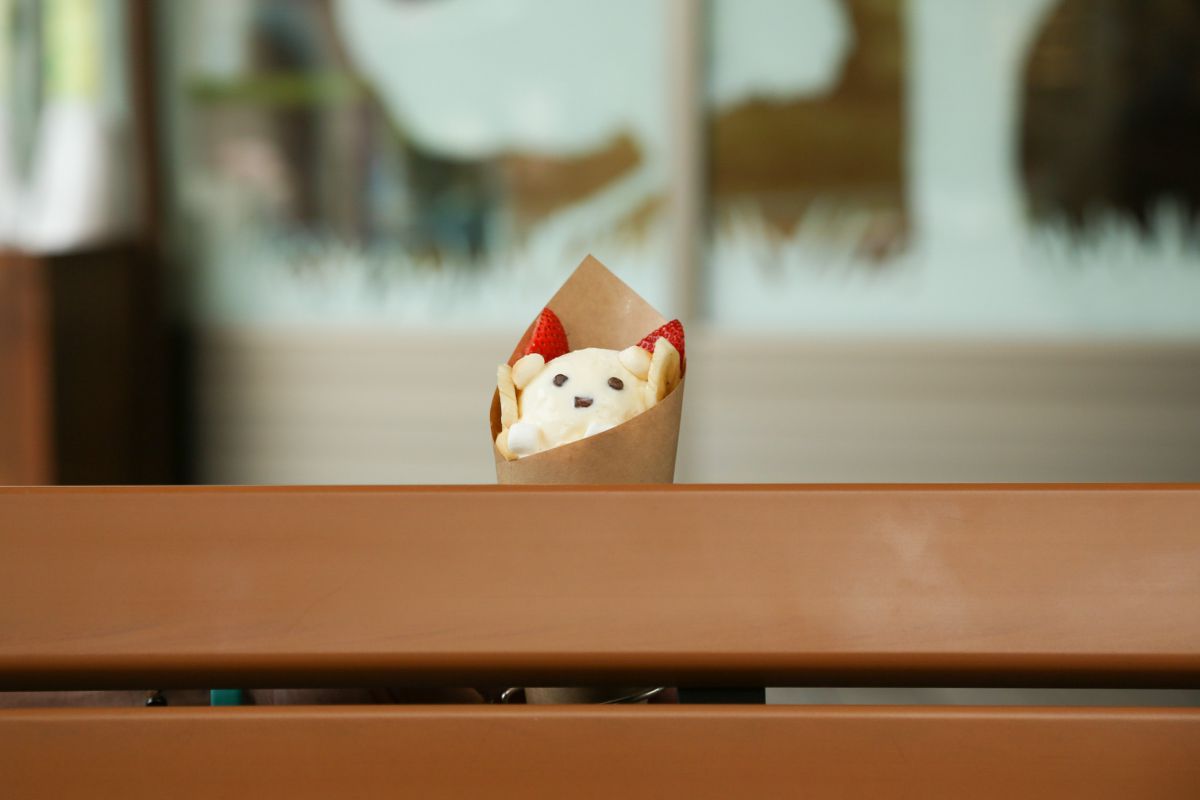 アイス系なら新登場のホッキョクグマクレープがおすすめ。生地から顔を出すホッキョクグマがとってもキュート♪ 耳はミルクボーロ、目・鼻はチョコレート、おててはマシュマロで、カットしたイチゴとバナナをトッピング。まるでホッキョクグマの赤ちゃんのよう…♡