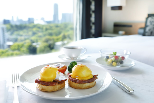このプランでは、女性人気の高い「クラシック エッグベネディクト(スモークターキー&ハム)」と、トッピングフルーツを組み合わせた専用のルームサービス朝食が提供されます。